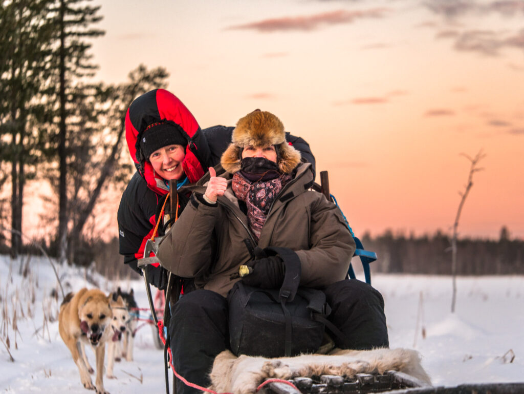 We will be out for a tour of around 15-20 km. Depending on the snow conditions, reindeer, and temperature, we change the actual route. You will either sit on the guide’s sled, or you can mush your own team, sharing a sled with somebody else.